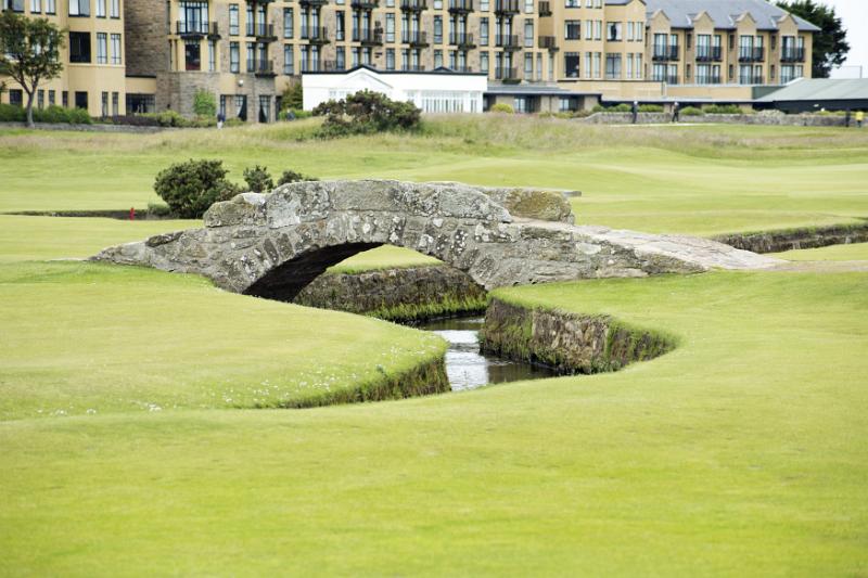 Picturesque view of the stone Swilken Bridge on St Andrews golf course, Scotland spanning a meandering stream between fairways with the town in the background
