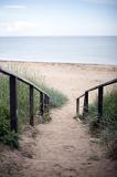 View of white fences and various golfers playing on golf green under overcast sky in Saint Andrews, Scotland