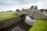 Cute little European fishing harbor with quaint storefronts and apartments near Saint Andrews cathedral ruins in Scotland