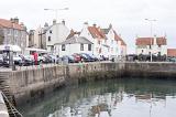 Little flowers in field in foreground on view of houses and hill at Pittenweem, Scotland during low tide