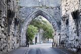 Flowing baskets near old stone church block entrance with arch in Saint Andrews, Scotland