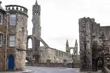 Stone barrier in front of old graveyard and towers of Saint Andrews Cathedral in Scotland with copy space in sky