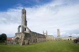 town hall building with with castle like angle tower and flag on top under blue sky in Saint Andrews, Scotland