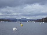 yachts moored on the calm waters of windermere, cumbria lake district with a clear blue sky