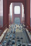 Golden Gate Bridge detail showing the structure of one of the towers with a communications dish and part of a suspension cable