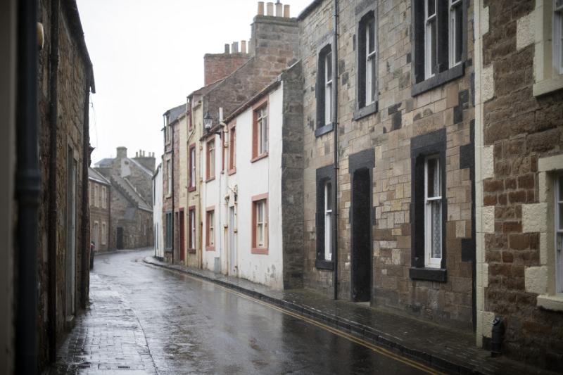 Empty brick road on rainy day in old village lined with stone apartment houses in Scotland