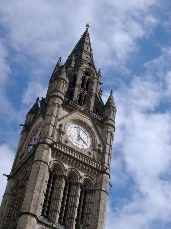 Ornate Gothic revival external facade of the Manchester Town Hall clock tower against a cloudy blue sky