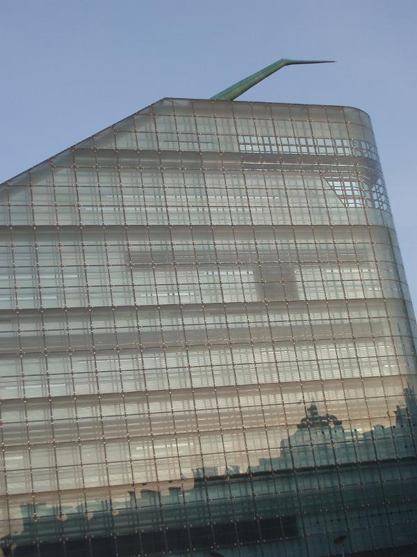 Modern glass exterior of the Urbis building, a futuristic museum and exhibition center in Manchester, Lancashire, UK