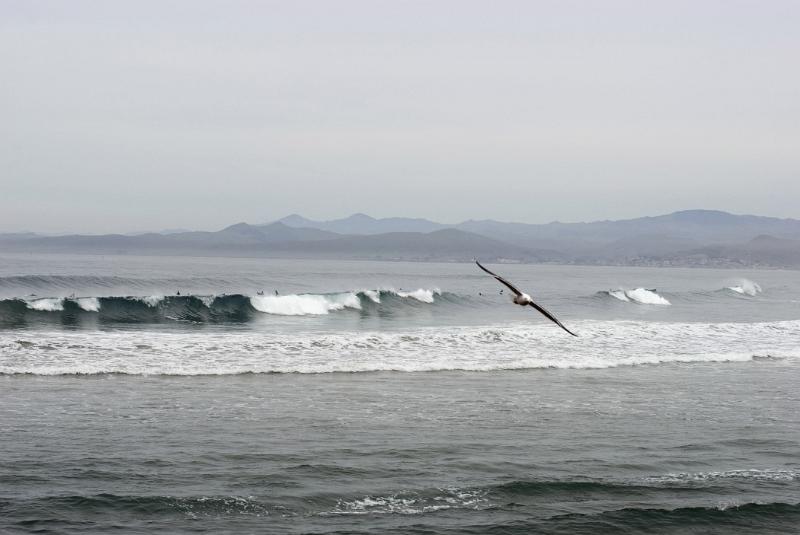 Bird Flying Above Waves of Beautiful Morro Bay Located in California. Captured in Extensive View with Mountains Afar.
