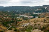 Scenic landscape with button grass, trees and high mountain peaks on the Tasmania Overland Track