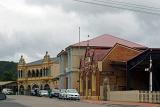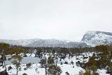 Rows and lines of apple trees on a Tasmanian farm under a blue sky with white fluffy clouds.